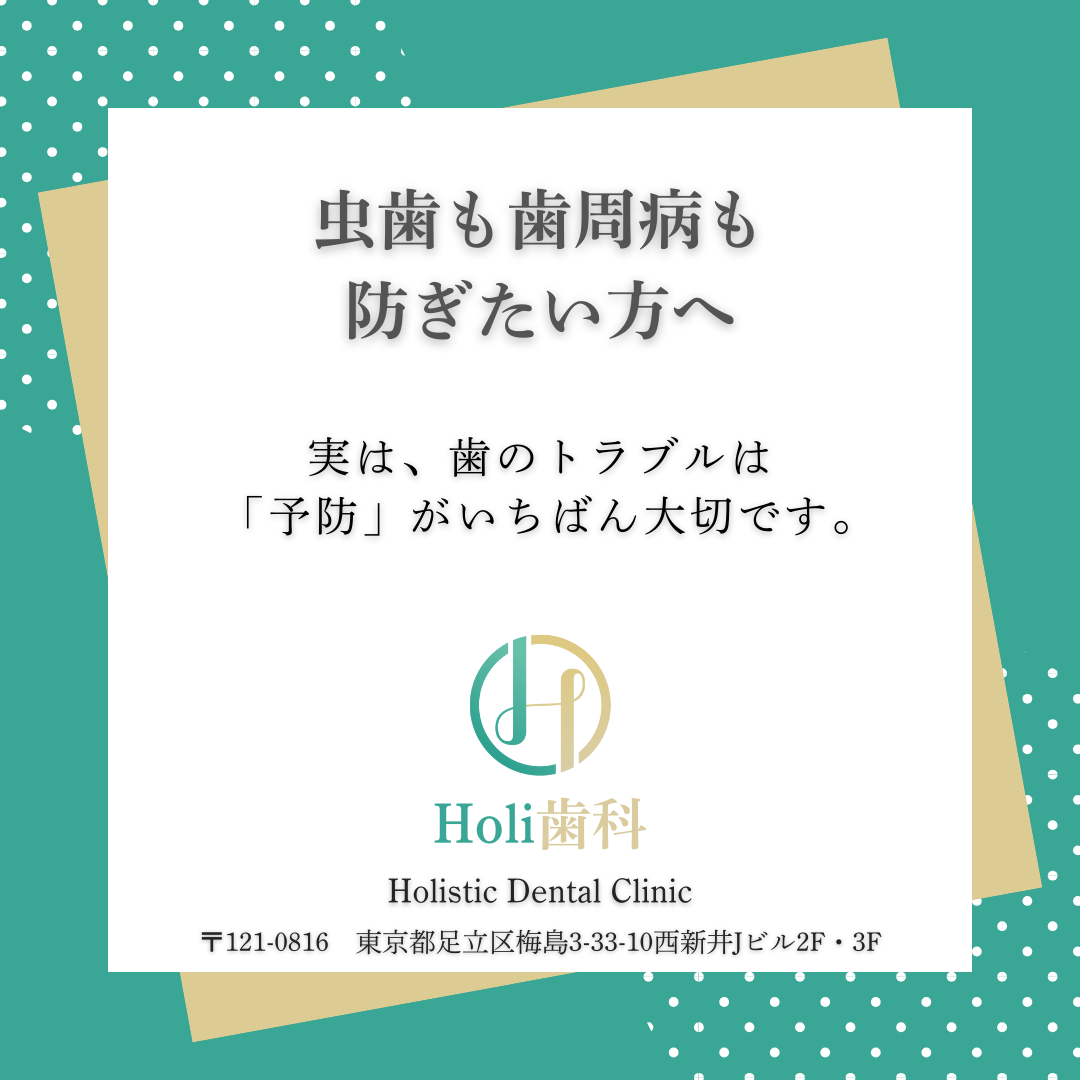 はじめに 足立区・西新井の歯医者「西新井Holi歯科」です。「歯が痛くなってから歯医者に行くもの」と思っていませんか?実は、虫歯や歯周病は症状が出る前に防ぐことができる病気です。 近年では、治療のための歯科”から“予防のための歯科へと考え方が変... -